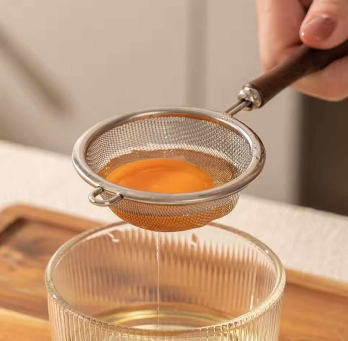 This 1PC fine mesh strainer with a wooden handle is perfect for achieving the desired consistency in your cooking and baking. The fine mesh ensures no lumps or impurities pass through, while the comfortable wooden handle allows for easy and secure handling. A must-have for any kitchen expert.