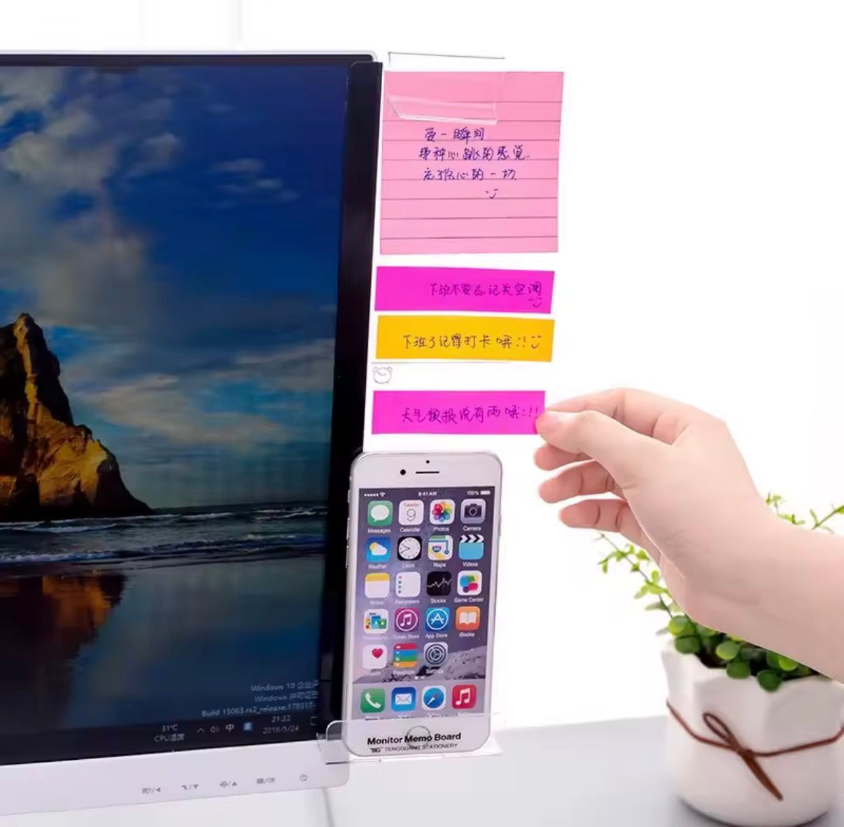 Introducing the Creative Acrylic Monitor Message Memo Board - a versatile addition to your desktop stationery. With the option to place it on the left or right of your PC, this transparent plastic holder serves as a sticky note, name card, and phone holder. Stay organized and efficient with this must-have desktop tool.
