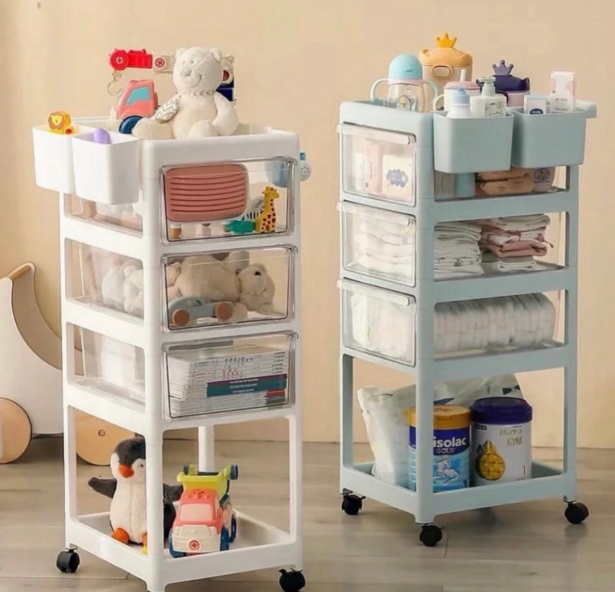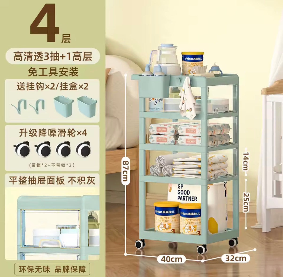 بصفتي خبيرة منتجات، أقدم لكم عربة تخزين لحديثي الولادة. تتميز هذه العربة المبتكرة بخزانة تخزين للأطفال لسهولة الوصول إلى أغراض طفلكِ، مثل الملابس والزجاجات. بفضل تصميمها البسيط وأربعة أدراج شفافة، فهي مريحة للأمهات بجانب سريرهن. متوفرة بلونين.