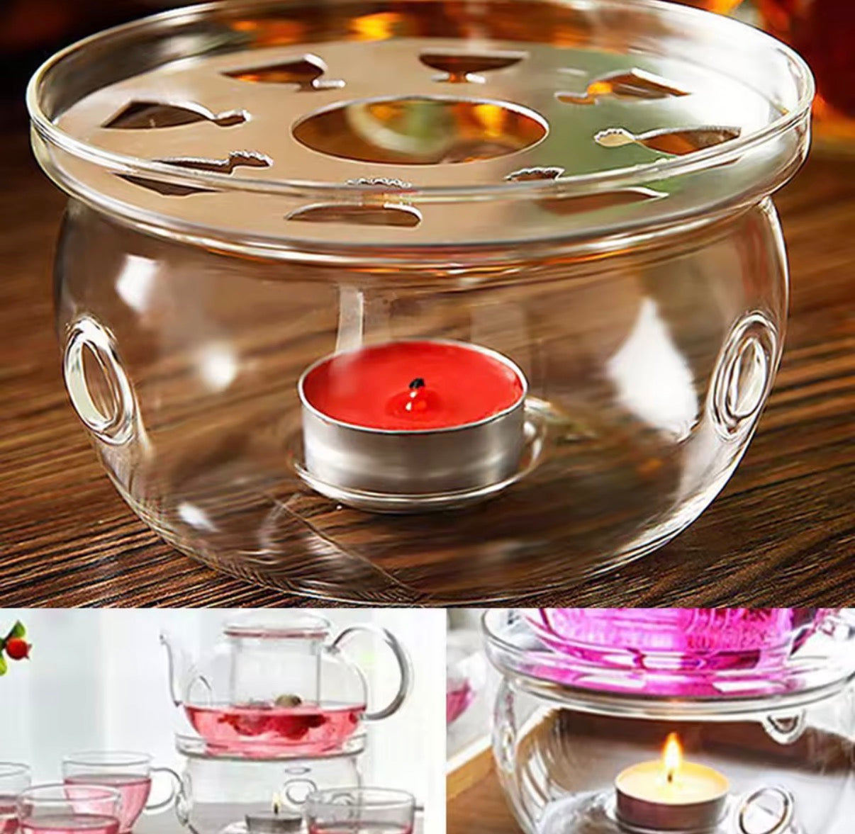 "The Round Teapot Warmer is the perfect accessory for your teapot, keeping your tea hot and delicious for hours. Made of high-quality glass, this warmer uses a candle to evenly heat your tea without altering the flavor. Enjoy a cozy cup of tea anytime with this elegant and practical addition to your teapot collection."
