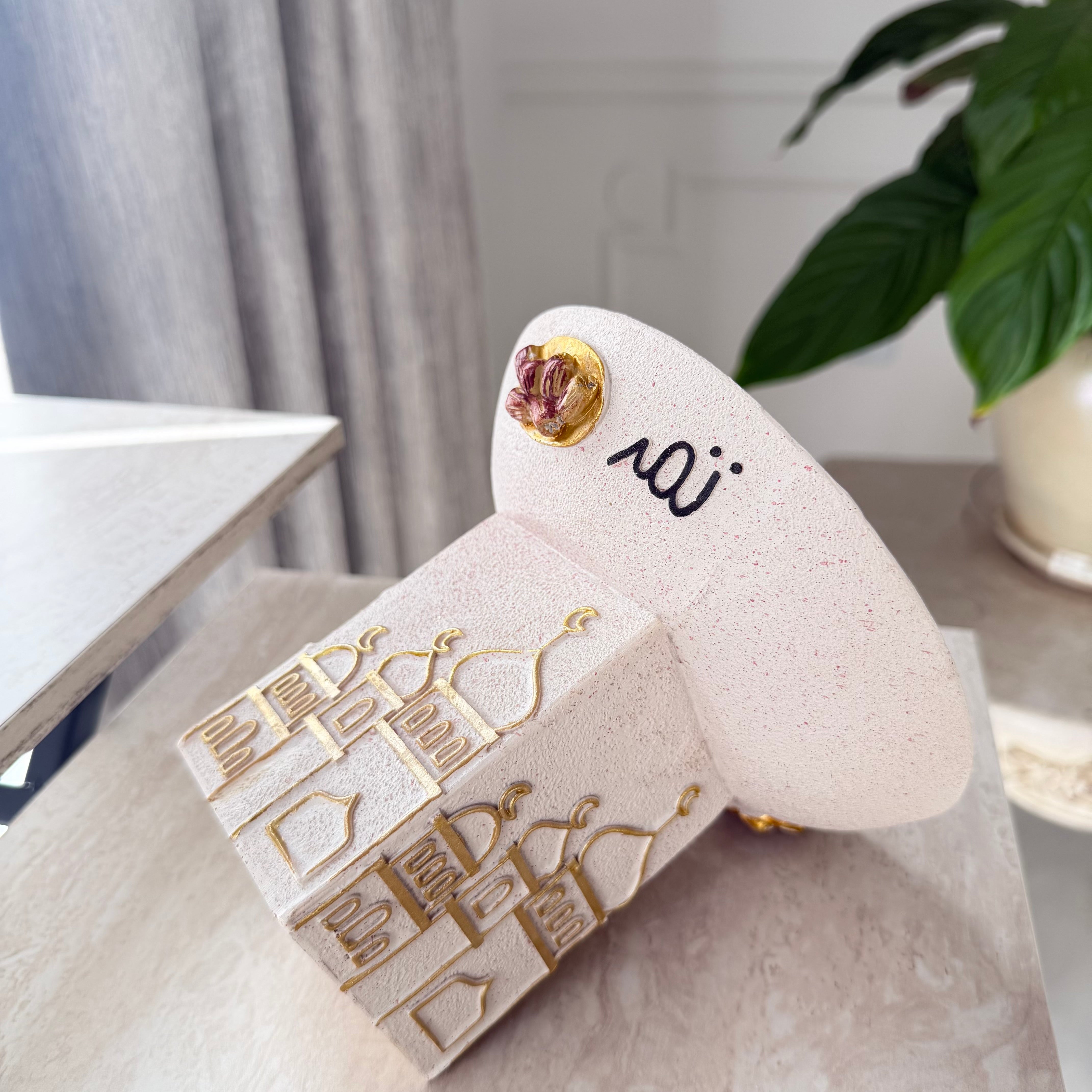 This Ramdan off-white resin stand for dates measures at 16*14 cm, providing a sturdy and elegant display for your dates. Made from durable and weather-resistant resin, it is a long-lasting addition to your home decor. Showcase your dates in style this Ramdan with our stand.