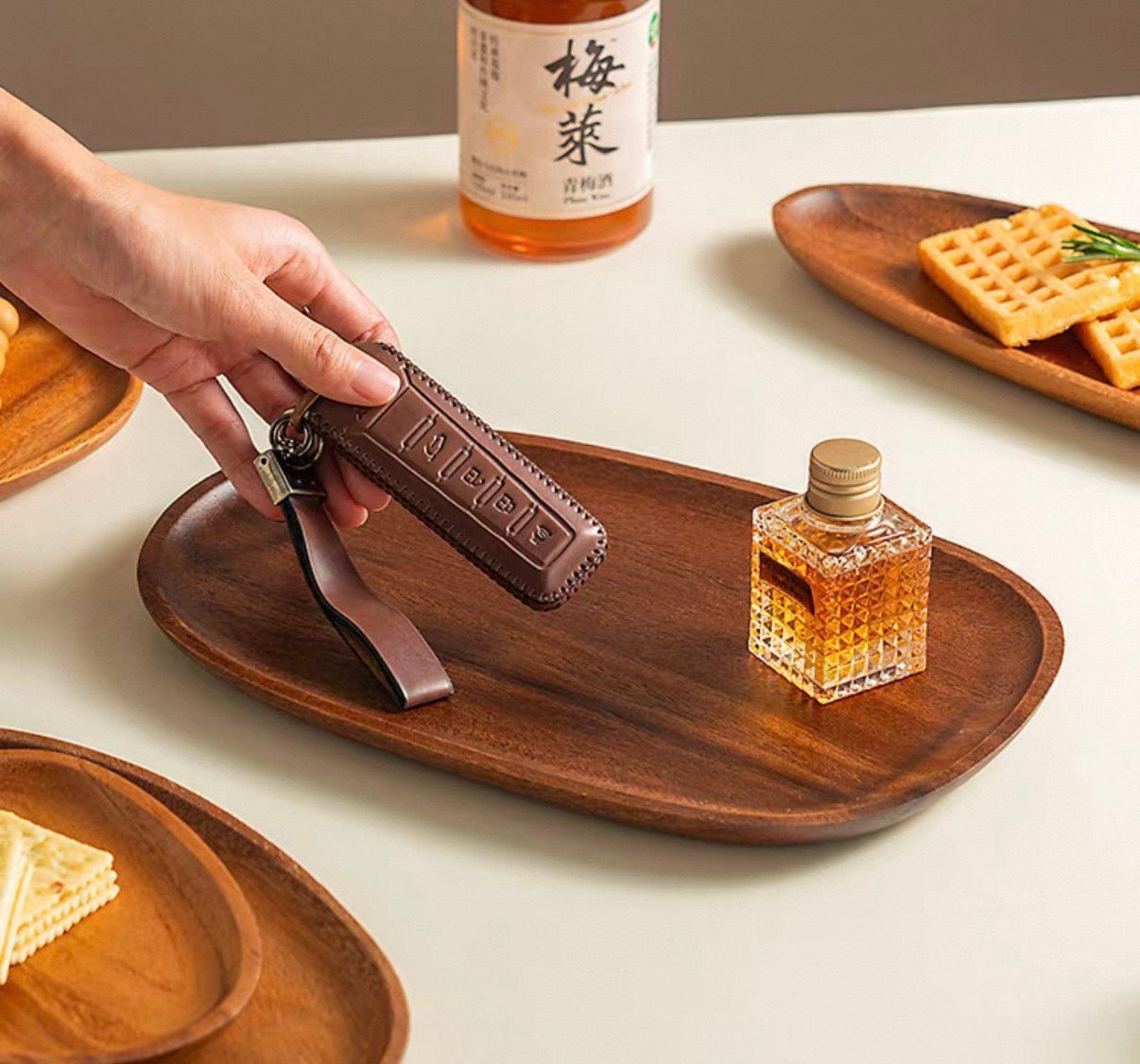 This Japanese-style wooden plate is made from natural walnut wood, providing a sturdy and elegant base for serving desserts, snacks, and dried fruits. Its round shape adds a touch of sophistication to any dining experience. Enhance your tableware collection with this versatile and charming walnut plate.